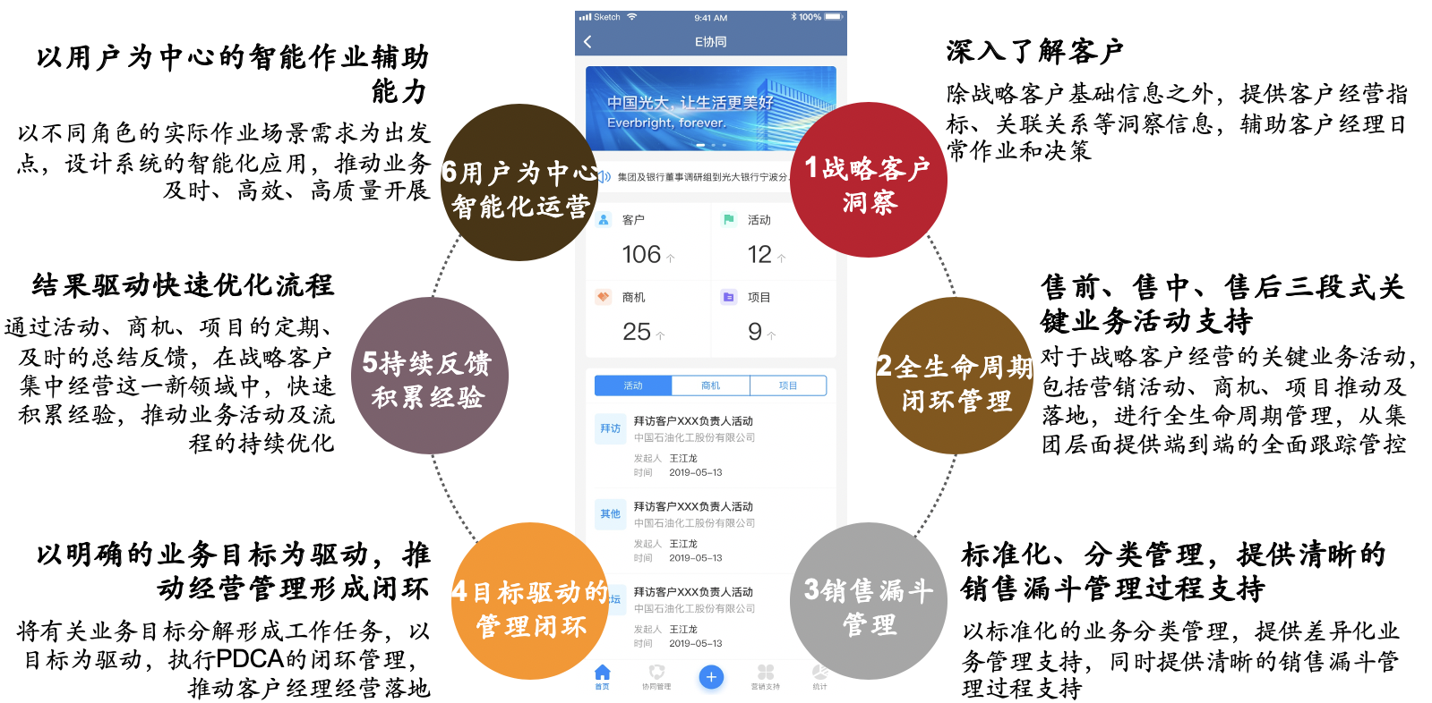 面向客戶(hù)經(jīng)理等管理及作業(yè)人員,圍繞營(yíng)銷(xiāo)活動(dòng)、商機(jī)、項(xiàng)目三個(gè)核心對(duì)象,聚焦三個(gè)閉環(huán)管理過(guò)程管理,進(jìn)行關(guān)鍵業(yè)務(wù)活動(dòng)管理和輔助作業(yè)能力建設(shè),形成從事前計(jì)劃、事中協(xié)同到事后跟蹤的協(xié)同工作閉環(huán)管理,協(xié)助客戶(hù)經(jīng)理更有效的統(tǒng)籌規(guī)劃各類(lèi)資源,更好的服務(wù)客戶(hù),通過(guò)對(duì)客戶(hù)以及協(xié)同工作的標(biāo)準(zhǔn)化管理起到客戶(hù)經(jīng)營(yíng)輔助決策的作用。