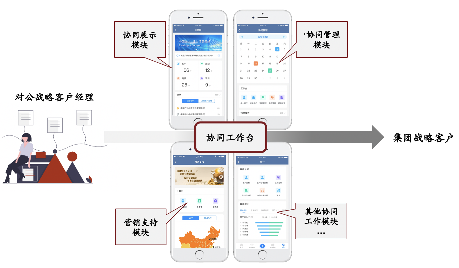協(xié)同工作平臺(tái)基于資源連接、協(xié)同作業(yè)支持、管理推動(dòng),實(shí)現(xiàn)集團(tuán)戰(zhàn)略客戶(hù)、對(duì)公客戶(hù)、個(gè)人客戶(hù)的協(xié)同目標(biāo)實(shí)現(xiàn)。